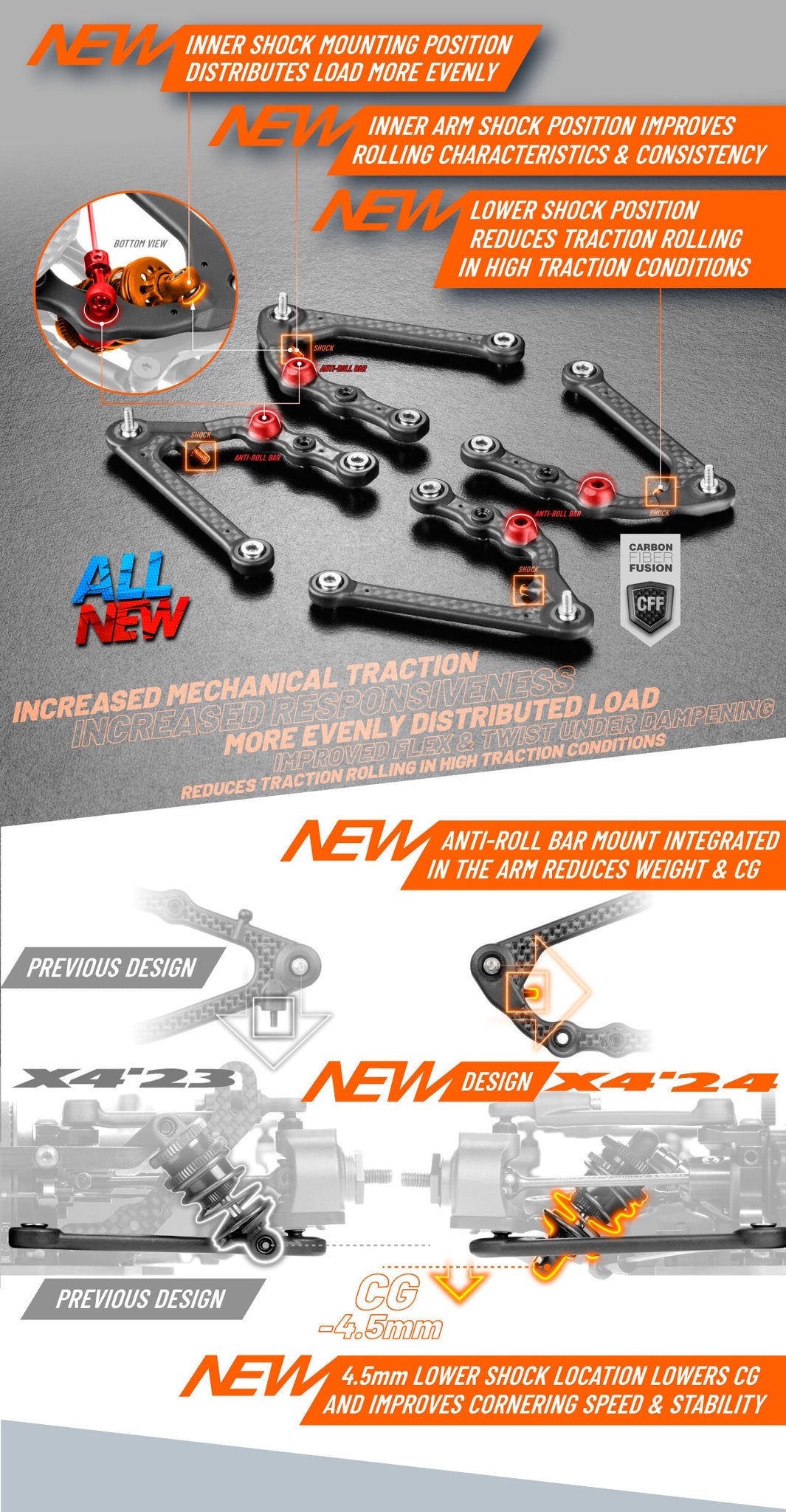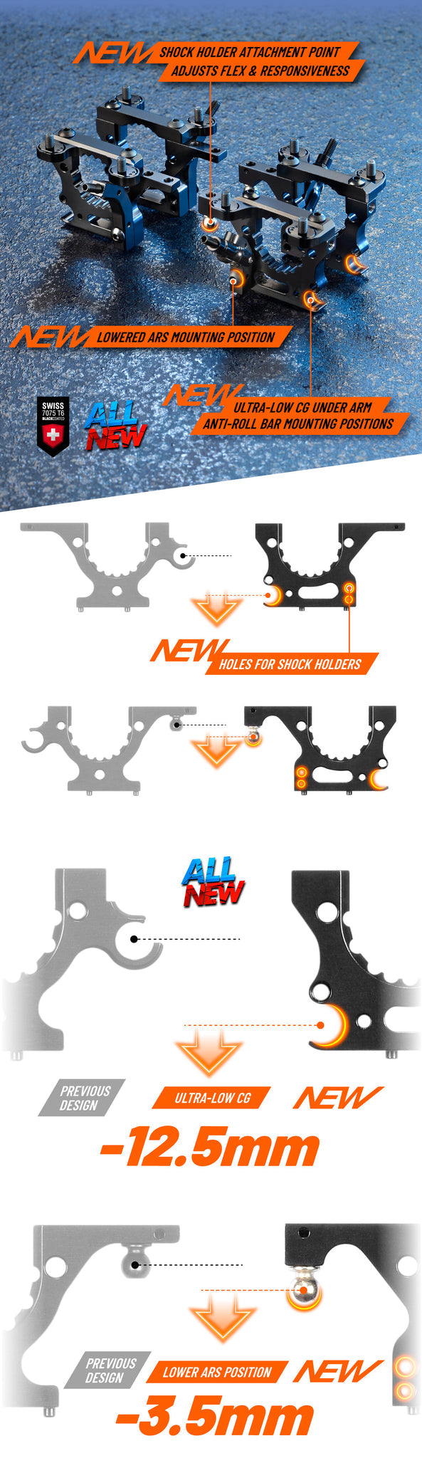 • Lower arms use under arm anti-roll bar mounting and reduce shock height by 4.5mm for ultra-low CG