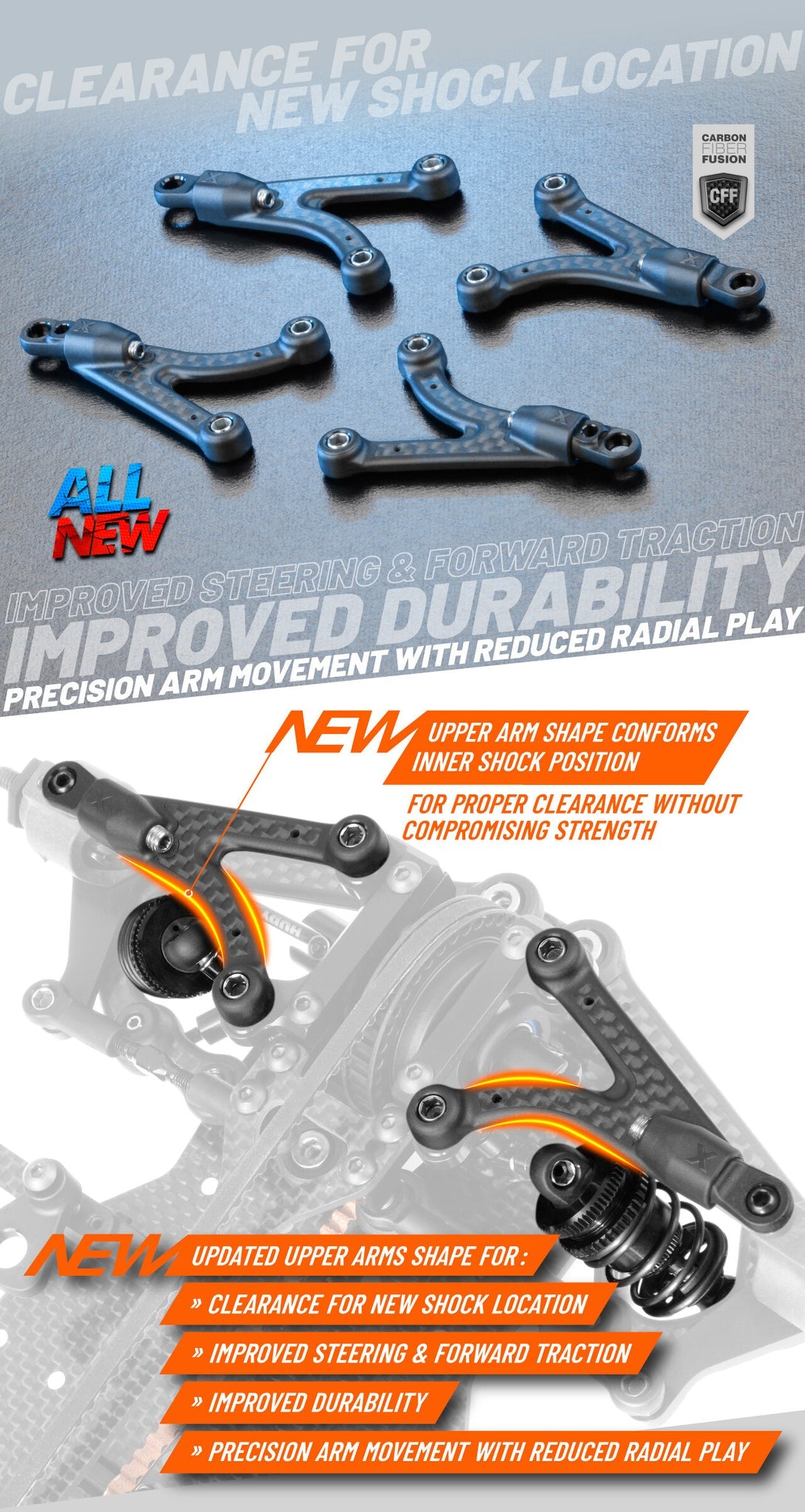 • Front steering plates with improved Ackermann positions integrate with the new arms and shock positions