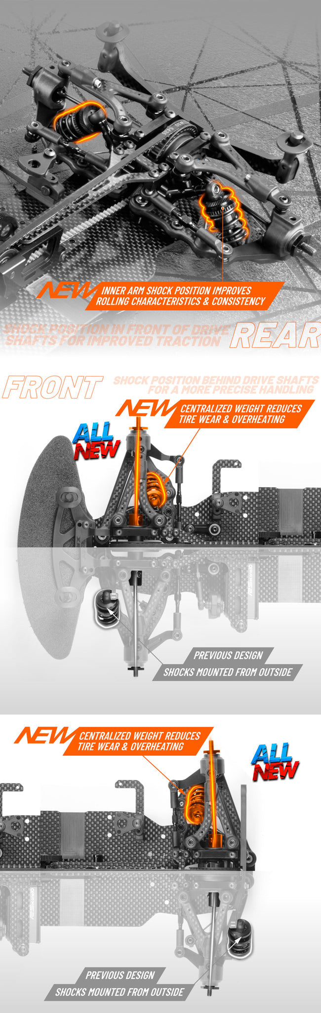 • New suspension arms with relocated shock positions improve lower arm flex and reduce twist under load