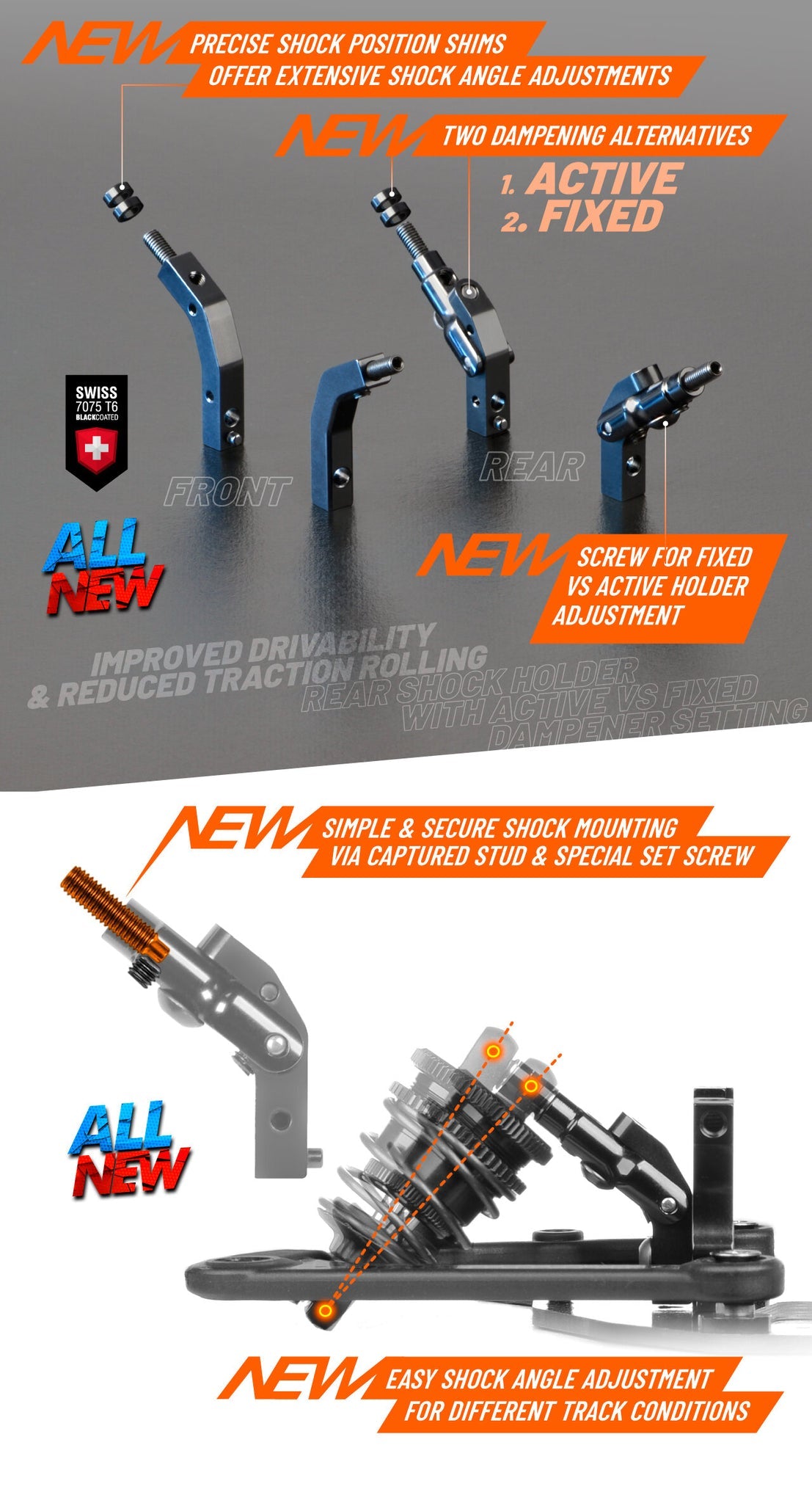 • Three different shock holder mounting options provide chassis flex alternatives to tune responsiveness and grip