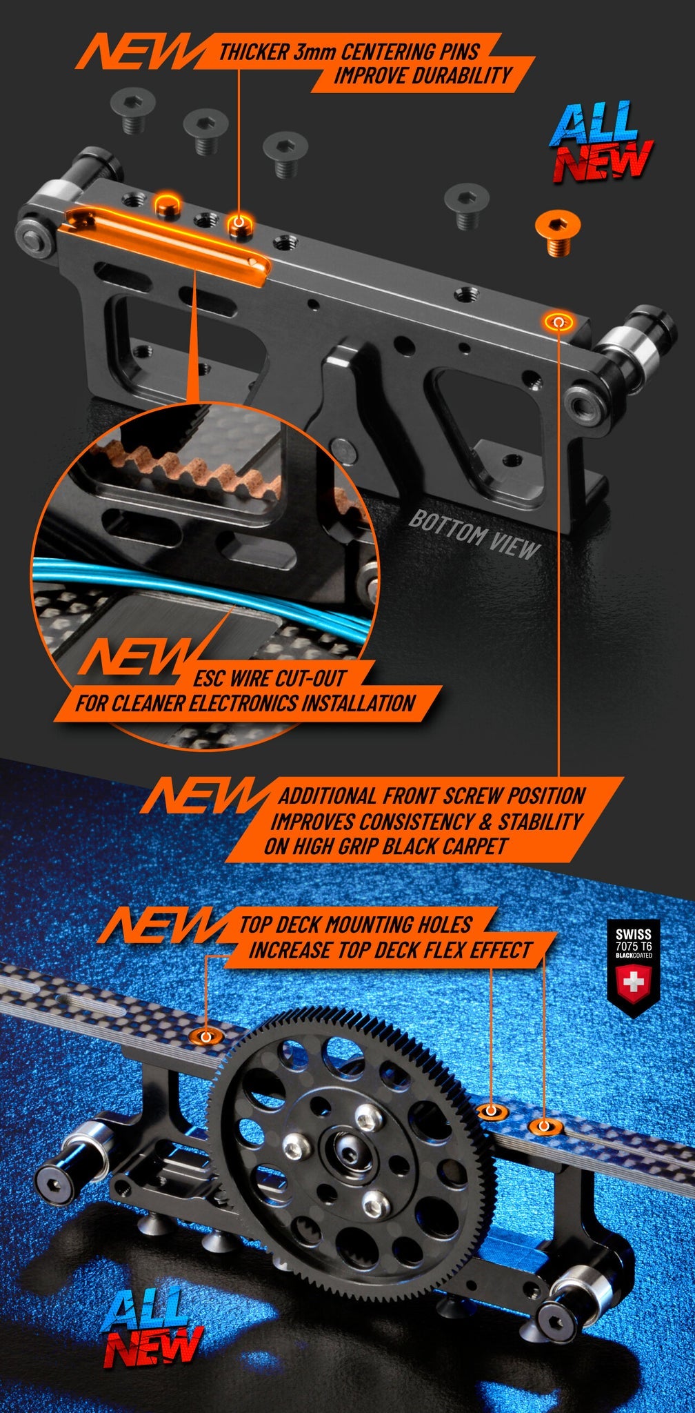 • 3mm centering pins and an additional forward motor mount attachment point improve durability and expand flex adjustments to provide improved stability on high grip black carpet tracks.